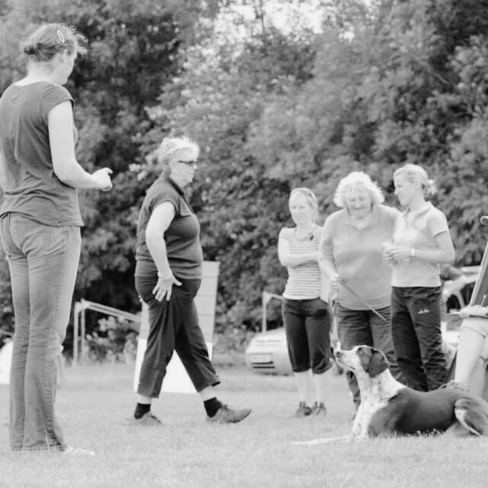 We start with individual training. One handler and one dog work at a time. We look at what the dog is doing and why, and introduce exercises that address the behaviour.
